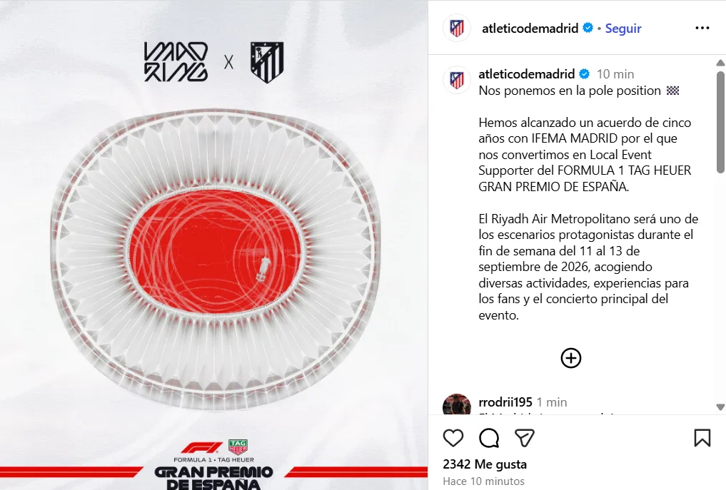 En ese contexto, el Atlético de Madrid, en medio de una temporada en la que con Julián Alvarez como máxima figura apunta a ganar LaLiga y pelear la Champions League, anunció este martes 4 de noviembre que alcanzó un acuerdo histórico de cinco años para que el Estadio Metropolitano se convierta en el ”Local Event Supporter” de lo que será el Gran Premio de España.