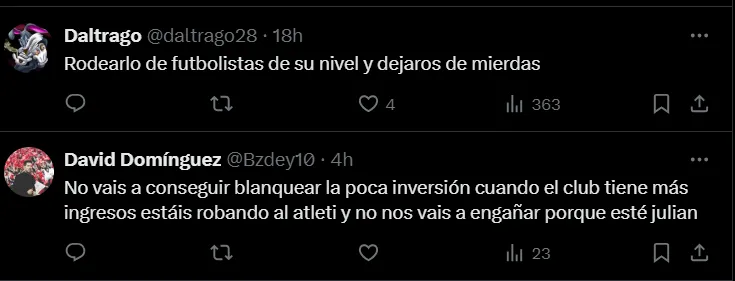 Los comentarios de los hinchas del Atlético de Madrid pidiendo por refuerzos