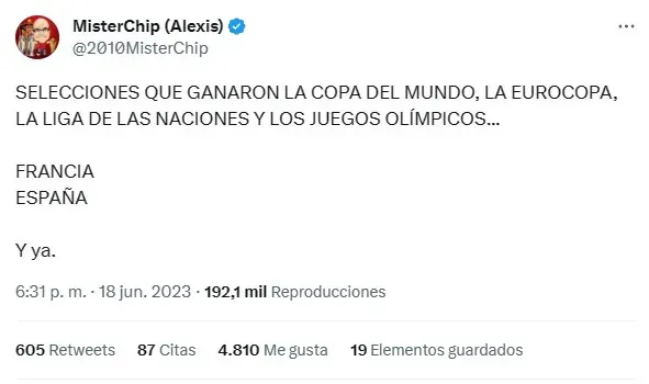 “Selecciones que ganaron la Copa del Mundo, la Eurocopa, la Liga de las Naciones y los Juegos Olímpicos: Francia, España y ya“, escribió el célebre analista de datos a través de Twitter. El cruce entre fanáticos de selecciones europeas y sudamericanas fue prácticamente inevitable, pese a que ese no fue el objetivo principal de MisterChip.