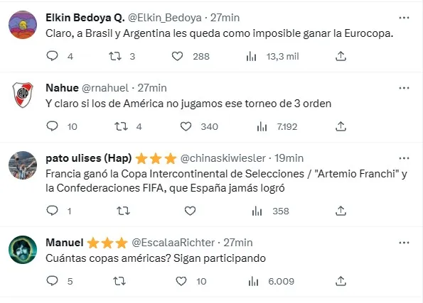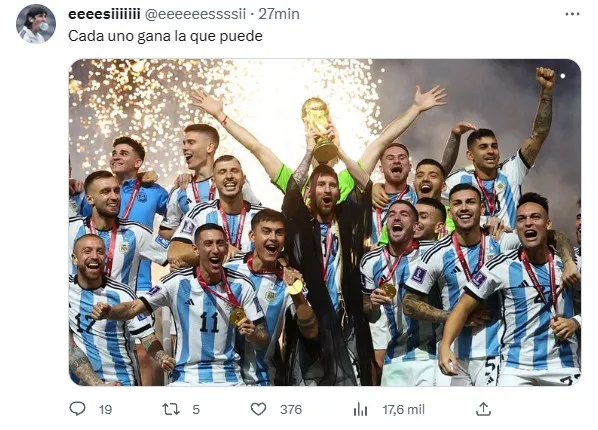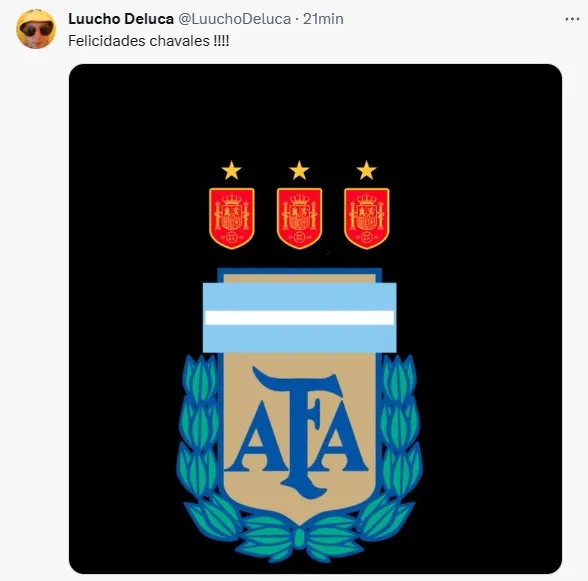 Obviando la parte en la que Argentina le es imposible competir en un torneo UEFA, el cual fue creado en 2018 con el objetivo de que los equipos del Viejo Continente le den mayor prioridad a las fechas FIFA, desde este lado del charco le contestaron al periodista español con imágenes alusivas a la Copa del Mundo que levantó Lionel Messi tras la victoria ante Francia y el revuelo en Twitter creció con el pasar de los minutos. Una discusión de nunca acabar.