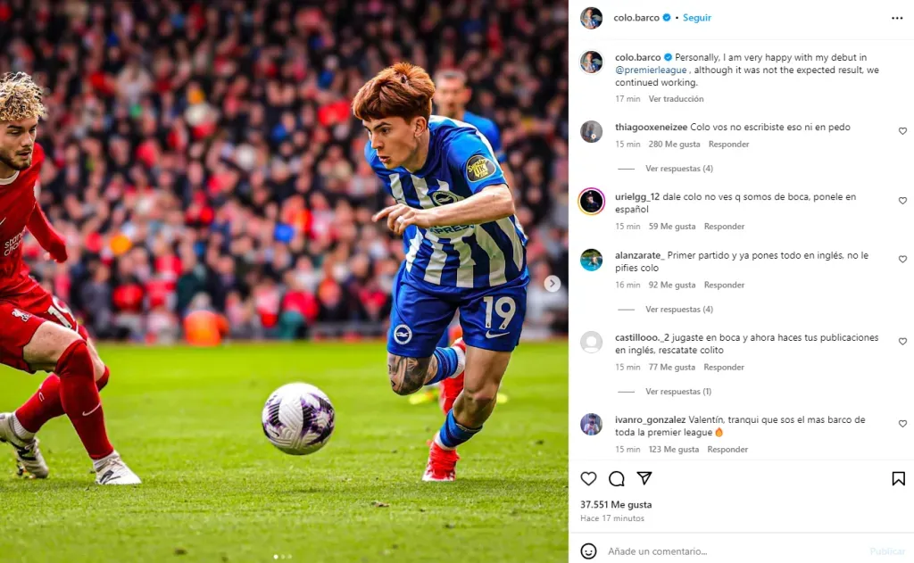 Tras el encuentro, Barco publicó un mensaje en su cuenta de Instagram con una imagen del choque ante Liverpool. “Personalmente, estoy muy feliz por mi debut en Premier League. Aunque no fue el resultado esperado, seguiremos trabajando“, escribió en inglés.