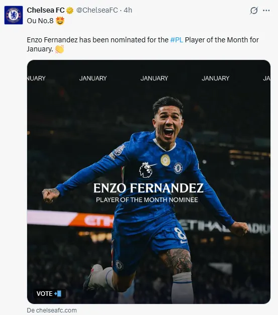 En esa misma línea, invitó a sus fans a que hicieran su colaboración para que el campeón del mundo en Qatar 2022 se quede con el galardón: ”La votación para el premio al Jugador del Mes de la Premier League de enero abre a las 11:00 h del jueves 5 de febrero. Puedes votar por Enzo aquí. El ganador se anunciará el viernes 13 de febrero a las 11:00 h (del Reino Unido)”.