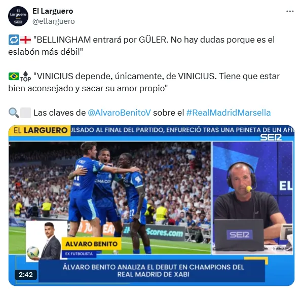 ”Bellingham entrará por Guler. No hay dudas porque es el eslabón más débil”, comentó el también exjugador del Real Madrid (entre 1995 y 2002). Con lo cual, de momento, Franco Mastantuono mantendrá su cupo en el once, con su labor como extremo por derecha, más allá de que algunos medios vaticinaron un mediocampo más poblado, con Bellingham de enganche y dos puntas: Vinícius y Kylian Mbappé.