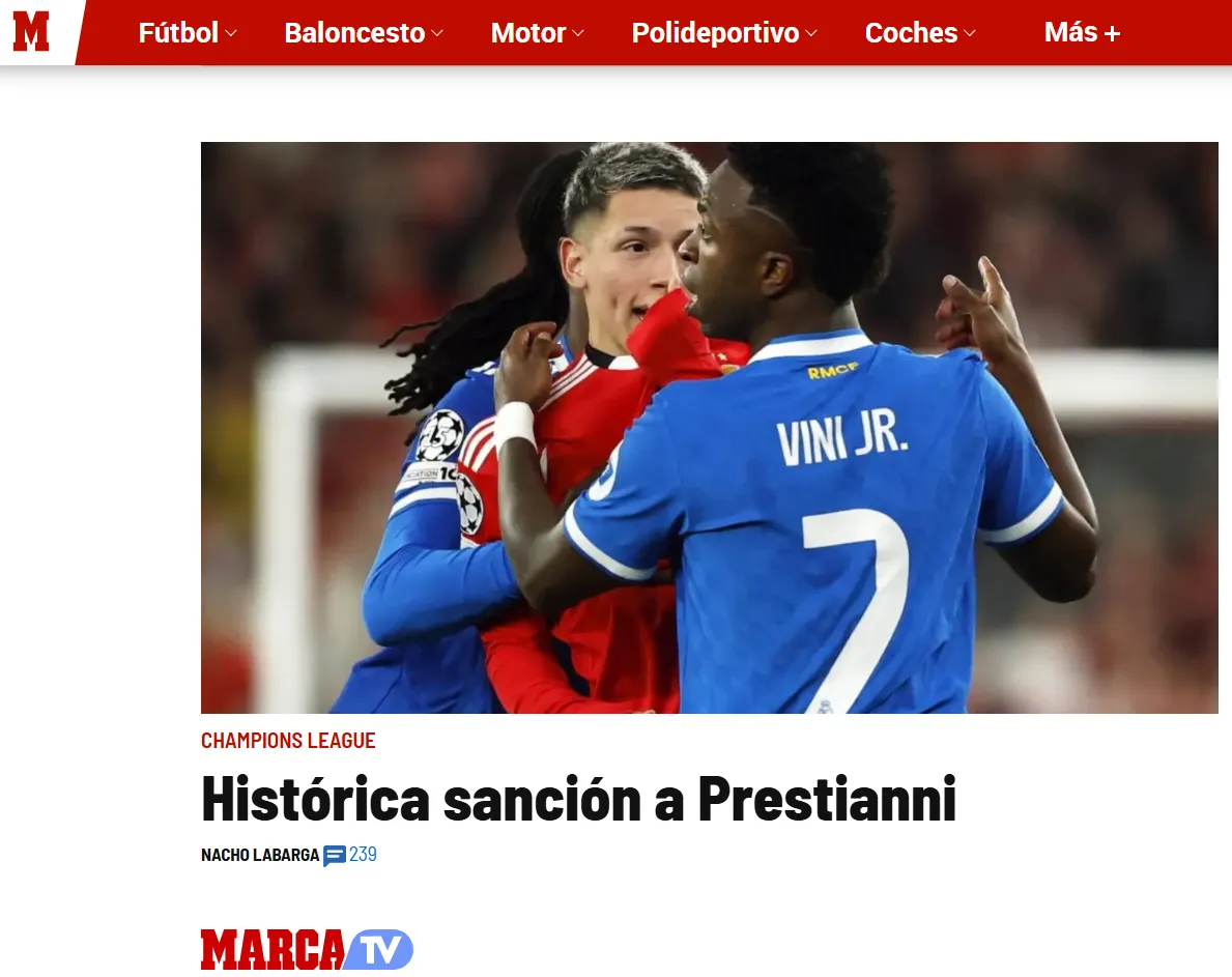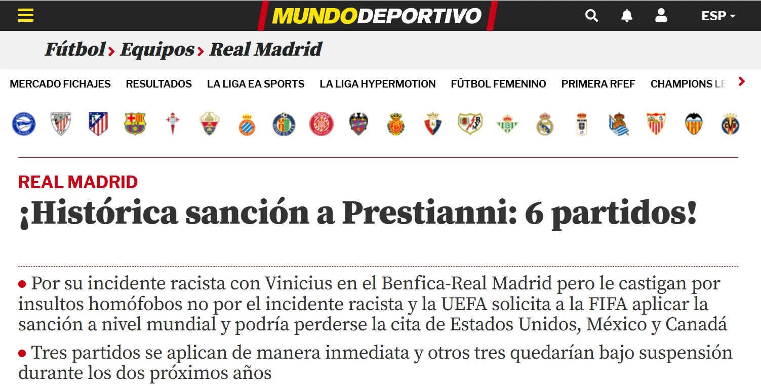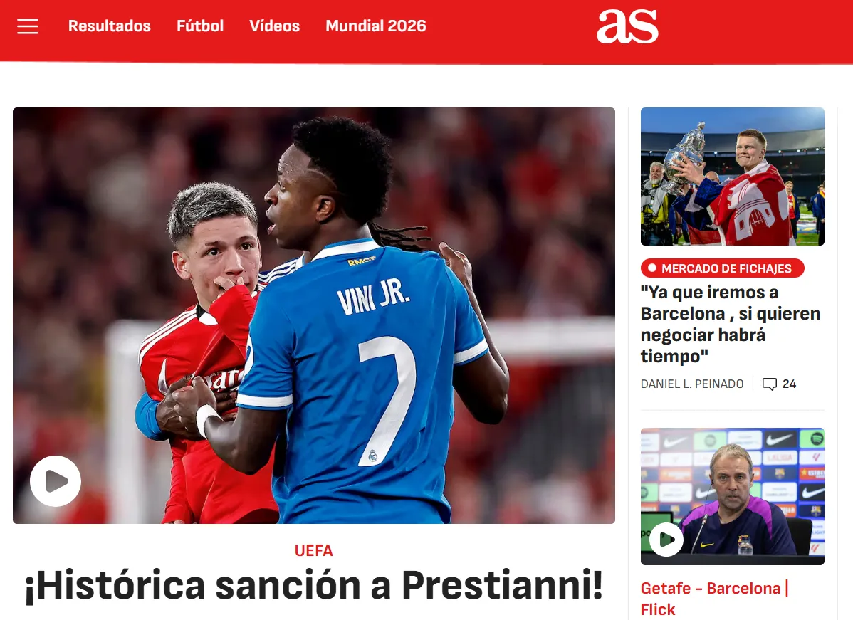 Tras conocerse la noticia, la prensa española, que fue sumamente dura con Gianluca Prestianni, cubieron el tema en sus portales. Tanto As, Marca y Mundo Deportivo, utilizaron la palabra “histórica” para referirse a la sanción, que finalmente fue por homofobia y no por racismo. Cabe recordar que, en su defensa, Prestianni afirmó haberle dicho “maricón” a Vinícius.