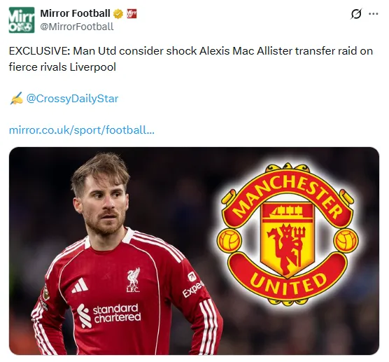 ”El Manchester United está en proceso de elaborar una lista de posibles objetivos para el mediocampo que el club intentará fichar en la ventana de transferencias del próximo verano, considerando una adquisición sorpresa por parte de su acérrimo rival, el Liverpool, para fichar a Alexis Mac Allister”, publicó este lunes 16 de febrero el sitio mencionado.
