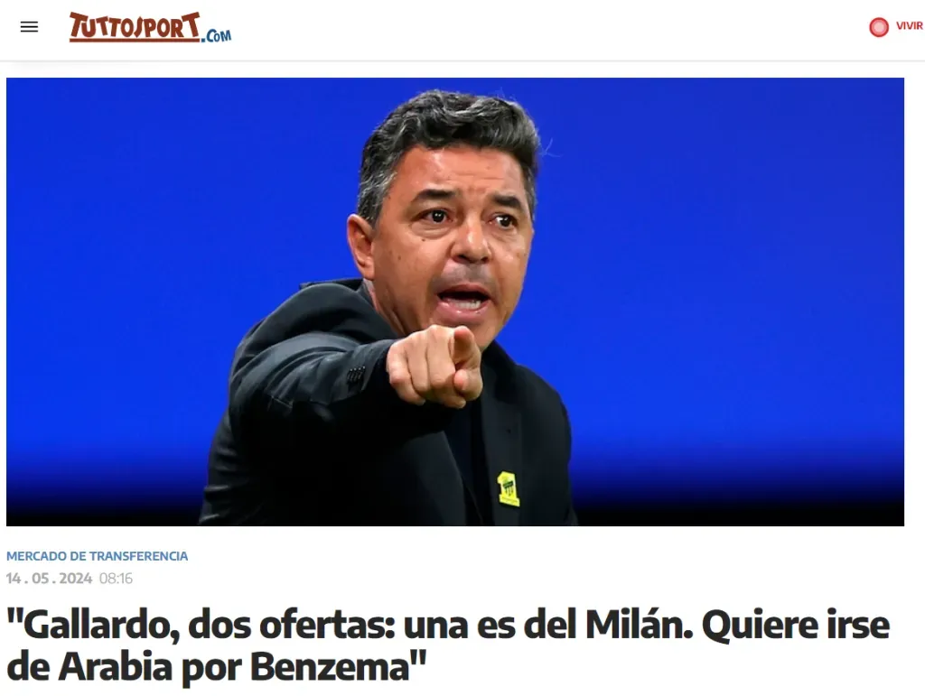 Tuttosport, prestigioso medio italiano, indica en su sitio web que Marcelo Gallardo tiene dos ofertas sobre la mesa, que una de ellas es del Milan y que el Muñeco dejó Al Ittihad por sus problemas con Karim Benezema. Dentro de la nota se refiere a la salida de Pioli del Rossonero al finalizar la temporada, a la cual solamente le quedan dos fechas y también resalta que el otro equipo interesado en el ex director técnico de River es el Sevilla de España.
