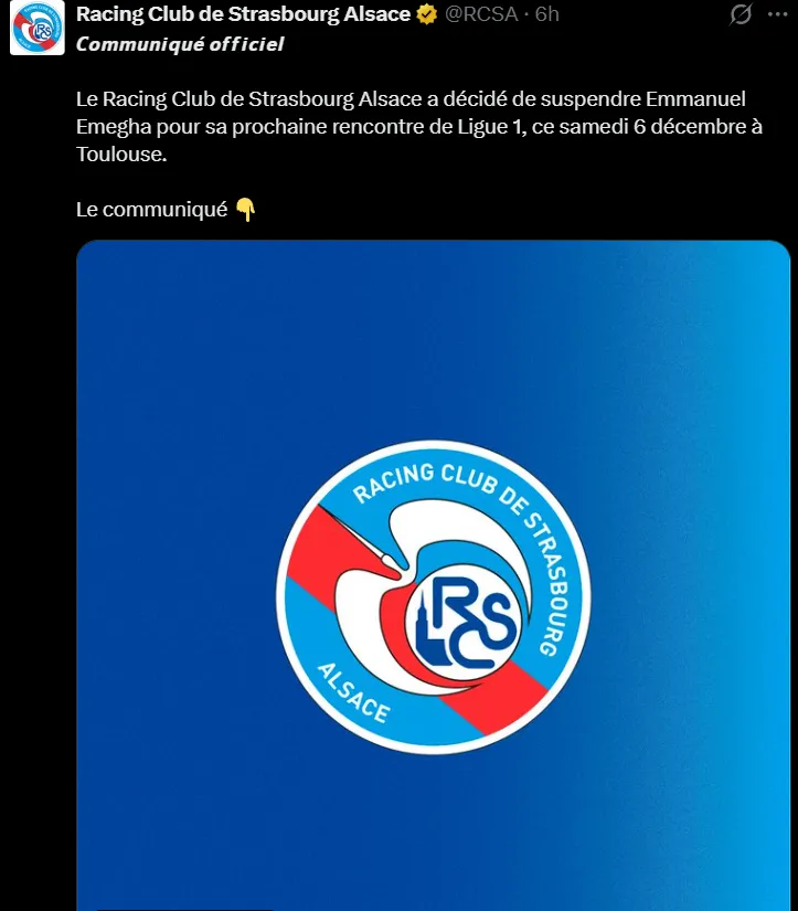 Poco después que Racing de Estrasburgo comunicara la medida disciplinaria, el propio Emanuel Emegha hizo un descargo en redes sociales. “Cometí errores y sé que aún tengo mucho que aprender. Quiero dejar claro que nunca quise hacer daño a nadie. Desde que llegué aquí con 19 años, siempre lo he dado todo por el Estrasburgo y estoy orgulloso de llevar el brazalete”, escribió en Instagram.