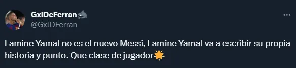 “El regate de doble contacto con un pie de Lamine Yamal se parece un poco a Messi. Gancho exterior ligeramente hacia atrás y sobre el mismo soporte retrocede hacia delante para eliminar al jugador. Arte grandioso“, llegó a poner una cuenta partidaria al Barça. Una brillante descripción para comparar al joven de 16 años con el argentino.