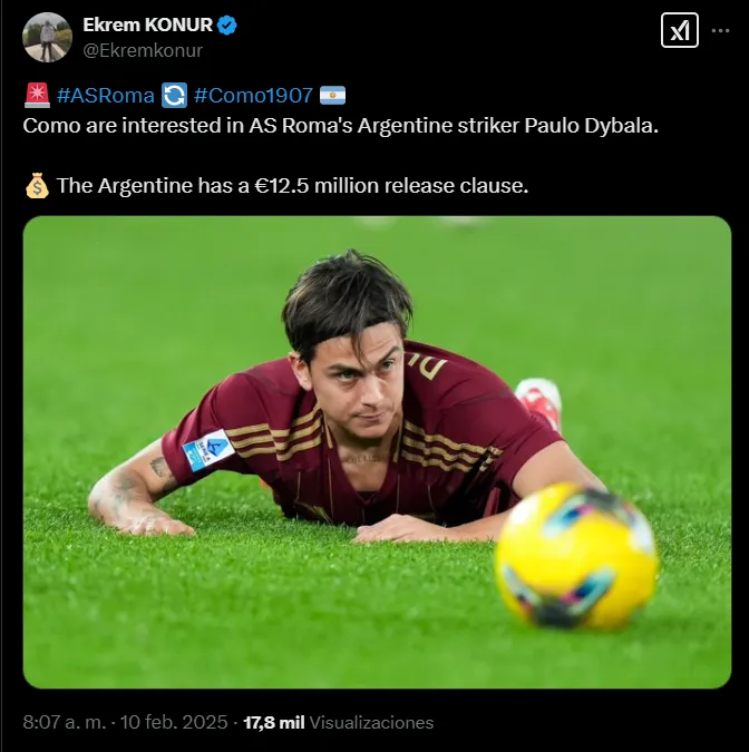 En este contexto, este lunes trascendió una noticia contundente respecto al futuro del cordobés de 31 años. Es que según lo que informó el periodista Ekrem Konur en sus redes sociales, Paulo Dybala interesa en el Como 1907, equipo que dirige Cesc Fábregas y que se reforzó fuertemente en el último mercado de pases para asegurar la permanencia en la Serie A.