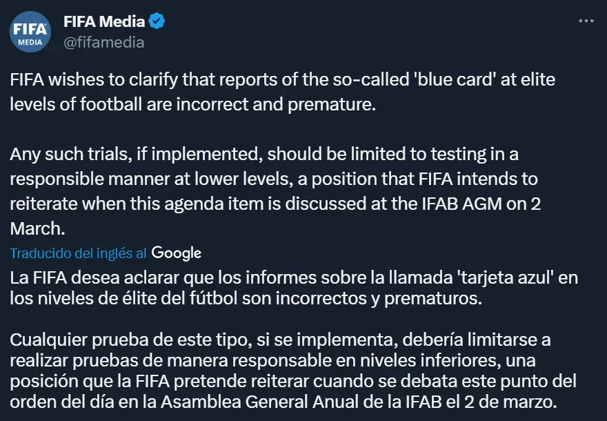 Desde la Federación Internacional de Fútbol Asociación emitieron un breve comunicado por medio de sus redes sociales, en donde explicaron que “los informes sobre la llamada ‘tarjeta azul’ en los niveles de élite del fútbol son incorrectos y prematuros”. Sin más preámbulos, descartaron una nueva modificación en el reglamento. Pero no se quedaron allí.