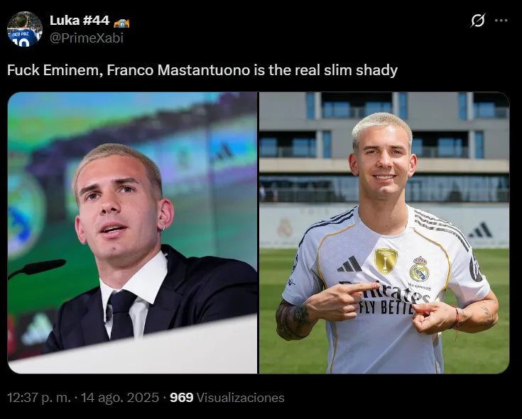 “Hasta los compañeros le dicen Eminem”, destacó uno de ellos. “‘Mis compañeros me dicen Eminem’, me tiene rodando”, expresó otro. “Seguro, luces como él, Franco”, escribió un tercero. Ya al momento de su presentación, otro fanático había presagiado el nuevo apodo del argentino en Real Madrid. “Al demonio con Eminem, Franco Mastantuono es ‘the real slim shady'”, comentó a una de las fotos de la sesión oficial haciendo referencia a uno de los grandes hits del rapero.