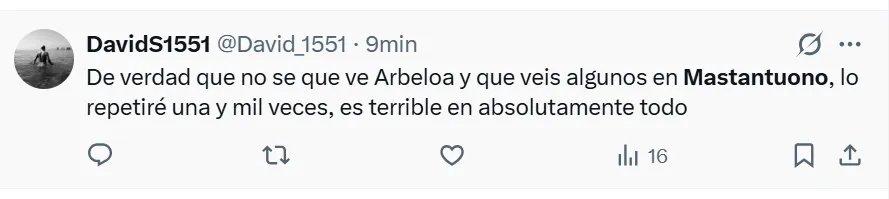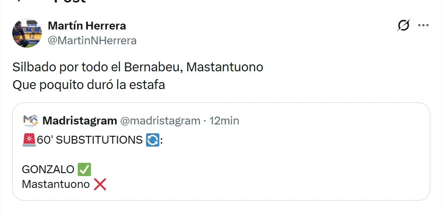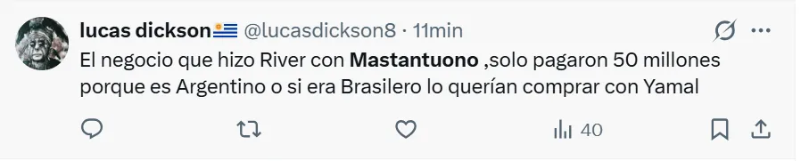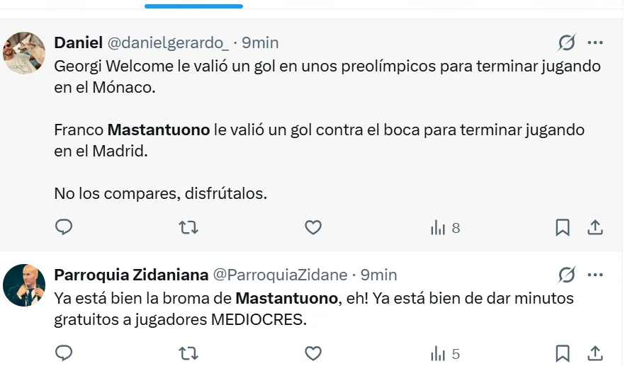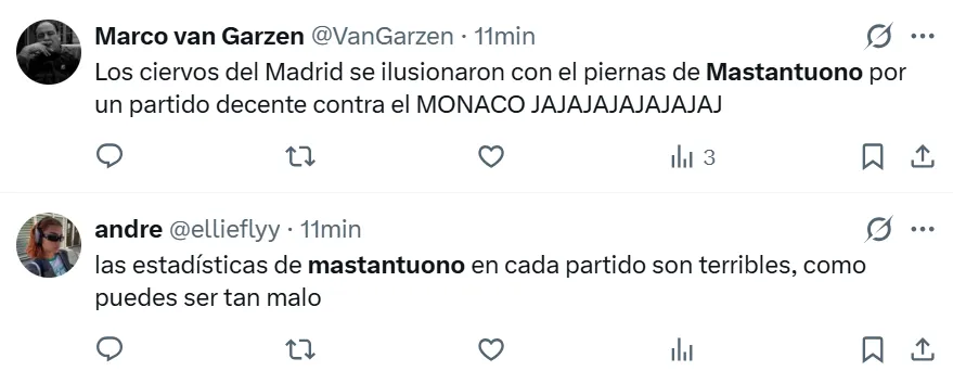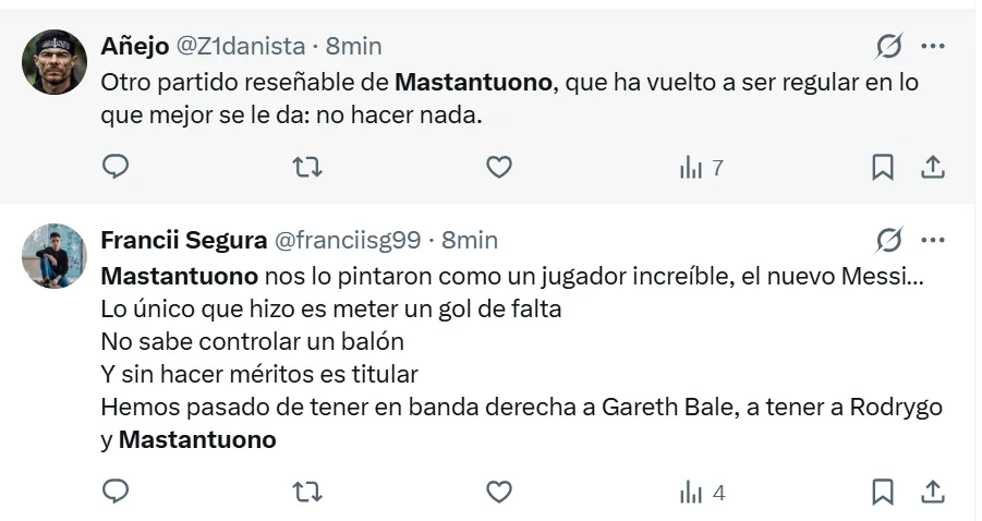 “Que poquito duró la estafa”, “Mastantuono es el peor Argentino que ha vestido la camiseta del Real Madrid…”, “Mastantuono no aporta nada”, “Muy pobre partido de Mastantuono”, Otro partido reseñable de Mastantuono”, fueron algunas de las críticas.
