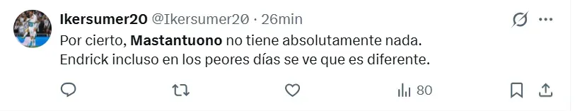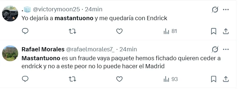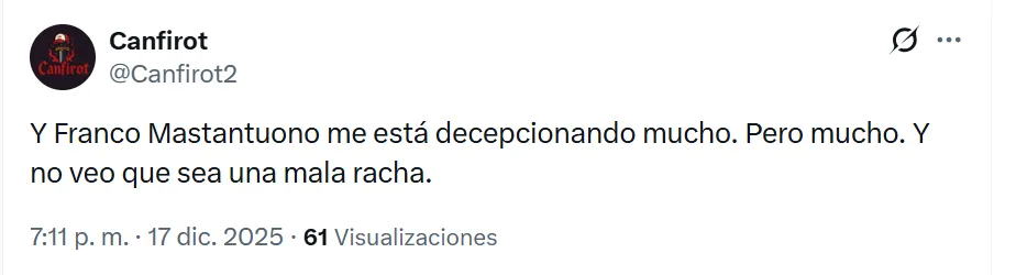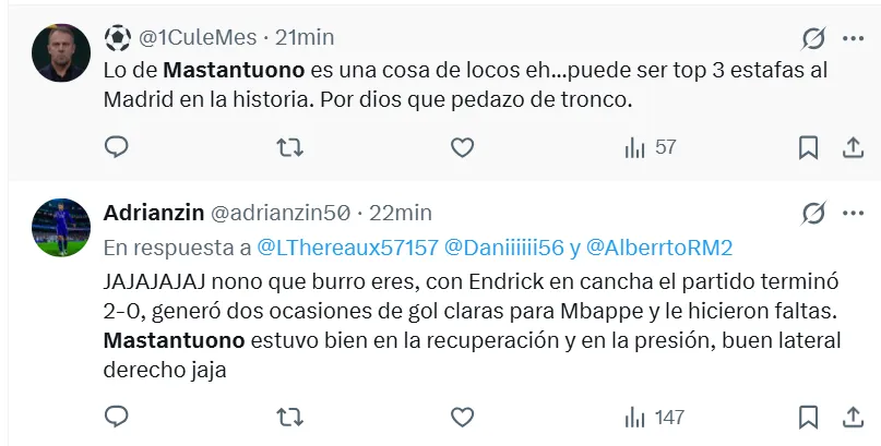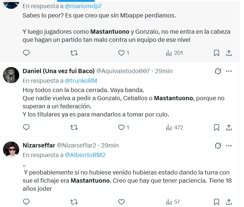 “Mastantuono es un fraude”, “No sé para qué compraron a Mastantuono”, “No puedo creer que dejemos ir a Endrick para quedarnos con Mastantuono”, “Franco Mastantuono me está decepcionando mucho”, “Puede ser top 3 de las estafas al Madrid”, fueron algunas de las críticas al argentino.