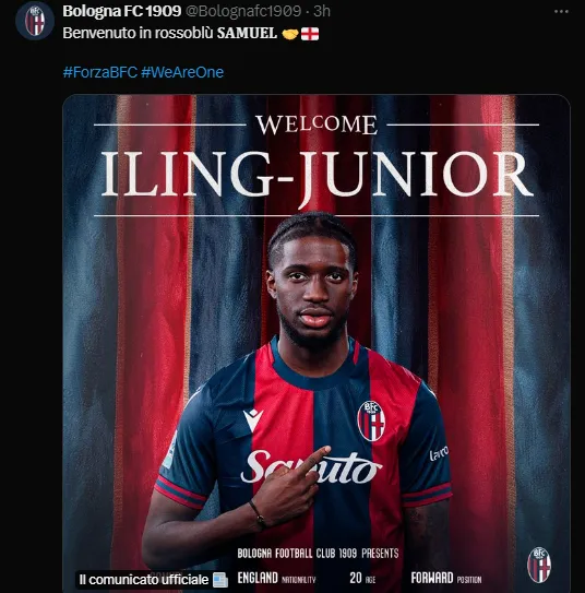 En concreto, el extremo Samuel Iling-Junior, quien llegó desde Juventus junto con el argentino Enzo Barrenechea a principios de julio, acaba de cerrar su cesión al Bolonia de la Serie A para tener más minutos durante esta temporada. El inglés de 20 años fue parte de la pretemporada pero no tuvo minutos en el equipo de Birmingham, por lo que desde el club italiano se acercaron con una propuesta por un préstamo y fue aceptado por Aston Villa.