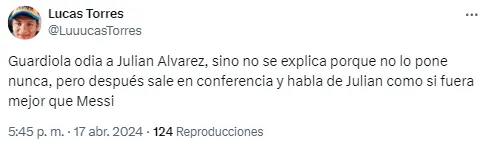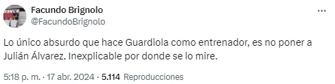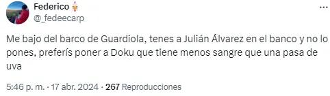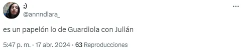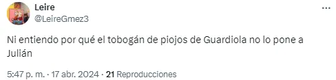 “Lo único absurdo que hace Guardiola como entrenador es no poner a Julián“, lanzó uno de los espectadores. Otro se hizo presente con un insulto típico: “Tobogán de piojos“.