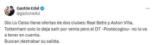 El panorama de Gio en el Viejo Continente no es sencillo. Ange Postecoglou, DT del Tottenham, no lo tendrá en cuenta para la próxima temporada en la Premier League y tanto el jugador como su agente comenzaron a explorar variantes, pero los Spurs solo lo dejarán ir mediante una transferencia y no vía cesión.