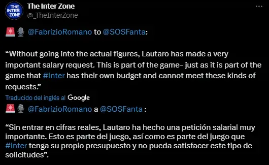 El periodista Fabrizio Romano informó al respecto, declarando que “Lautaro ha hecho una petición salarial muy importante“. Además, añadió: “Esto es parte del juego, así como es parte del juego que Inter tenga su propio presupuesto y no pueda satisfacer este tipo de solicitudes“.