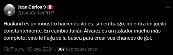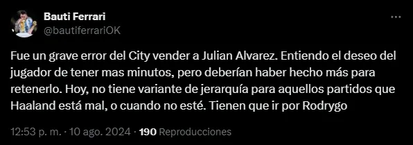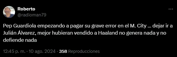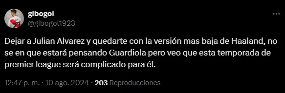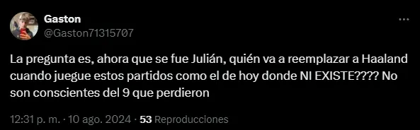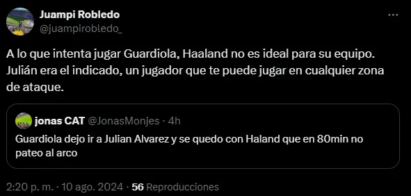 “Fue un grave error del City vender a Julián Álvarez“, “quedarte con la versión más baja de Haaland, no sé en que estará pensando Guardiola“, “ahora que se fue Álvarez, ¿quién va a reemplazar a Haaland?” y “a lo que intenta jugar Guardiola, Haaland no es ideal para su equipo, Julián era el indicado“, fueron algunos de los tantos comentarios que se leyeron en X (Twitter) al respecto.