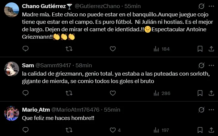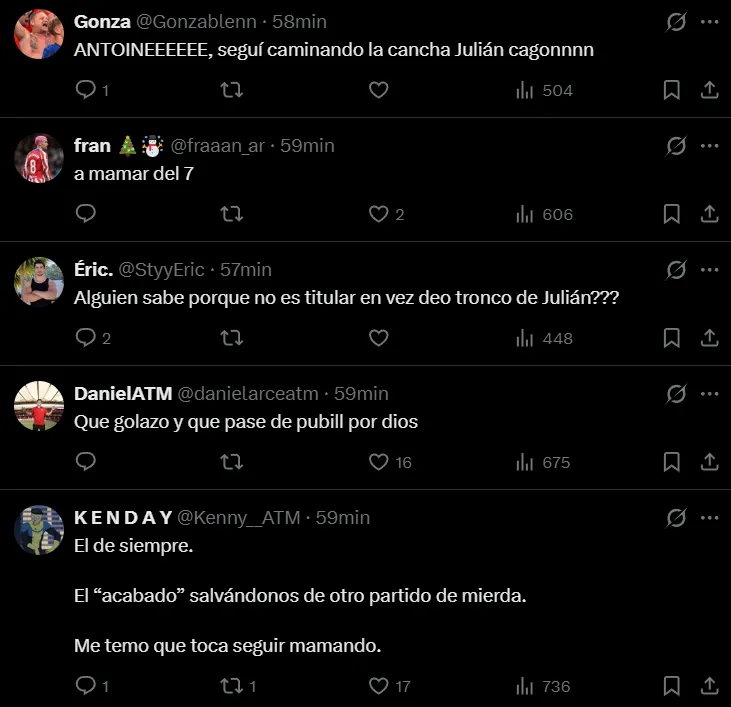 “El de siempre, ‘el acabado’ salvándonos en otro partido”, escribió uno de ellos como elogio al francés. “ANTOINE. Sigue caminando la cancha, Julián”, expresó otro que aprovechó a recriminar al argentino por su partido. “¿Alguien sabe por qué no es titular en lugar del tronco de Julián?”, se preguntó un tercero. “Madre mía. Este chico no puede estar en el banquillo. Aunque juegue cojo tiene que estar en el campo. Es puro fútbol. Ni Julián ni hostias. Es el mejor de largo. Dejen de mirar el carnet de identidad”, manifestó uno más.