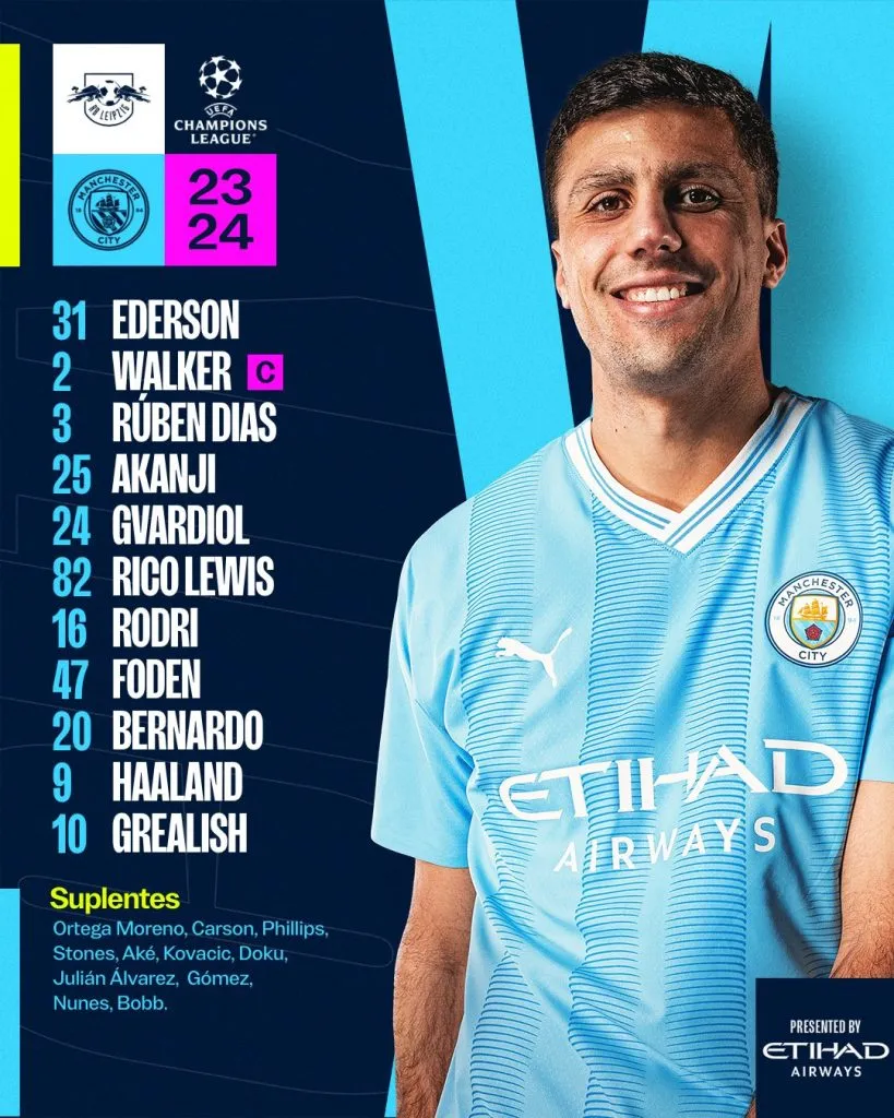 Con la presencia de Julián Álvarez entre los suplentes, los titulares de los Citiziens para enfrentar a RB Leipzig serán Ederson; Kyle Walker, Rúben Dias, Manuel Akanji, Joško Gvardiol; Rico Lewis, Rodri; Phil Foden, Bernardo Silva, Jack Grealish; y Erling Haaland.