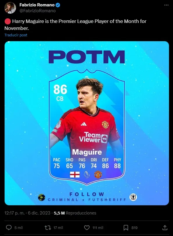 Un poco a modo de broma, por los reiterados bloopers y errores que ha realizado el futbolista del seleccionado inglés desde su llegada al Manchester United, y un poco como reflejo de su nivel en este último mes, lo cierto es que los fanáticos eligieron a Maguire como el POTM de la Premier League en noviembre 2023.