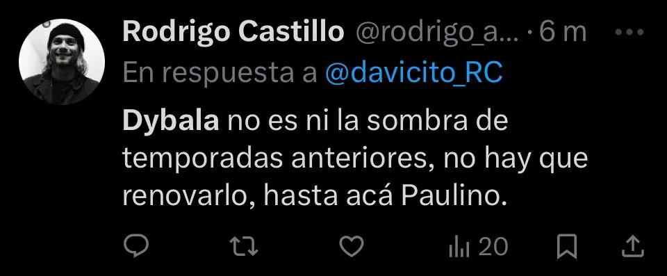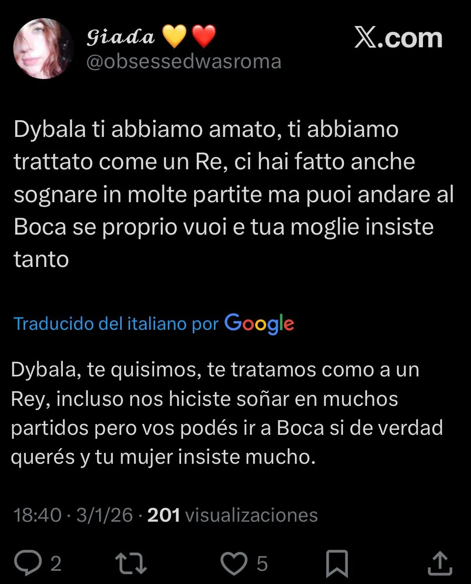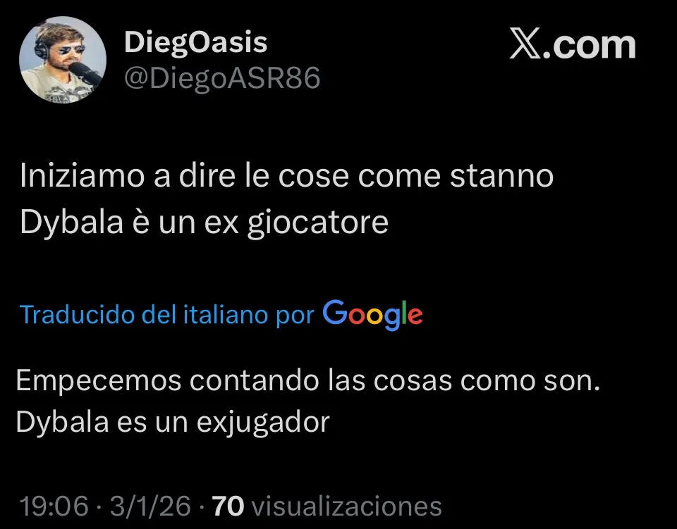 El momento que encendió la mecha de las críticas ocurrió cuando el cordobés aprovechó una mala salida del fondo rival y quedó mano a mano frente al arquero. Sin embargo, al considerar que el ángulo de tiro se cerraba, Dybala optó por no rematar y buscó un pase al medio para asistir a un compañero que llegaba por el centro. La ejecución fue imprecisa y la chance clara del empate se diluyó. Esa jugada fue el detonante para que los hinchas explotaran en redes, cuestionándole un serio bajón futbolístico.