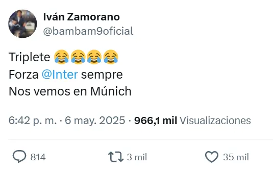“Triplete“, escribió el exfutbolista con muchos emojis de risa, celebrando que el conjunto blaugrana no podrá obtener la triple corona esta temporada. Además, agregó: “Forza Inter sempre. Nos vemos en Múnich“. El mensaje tuvo más de 3 mil retuits.