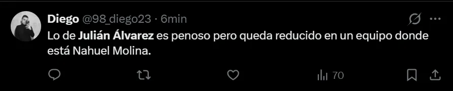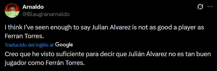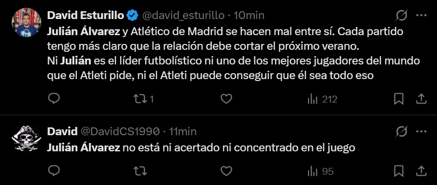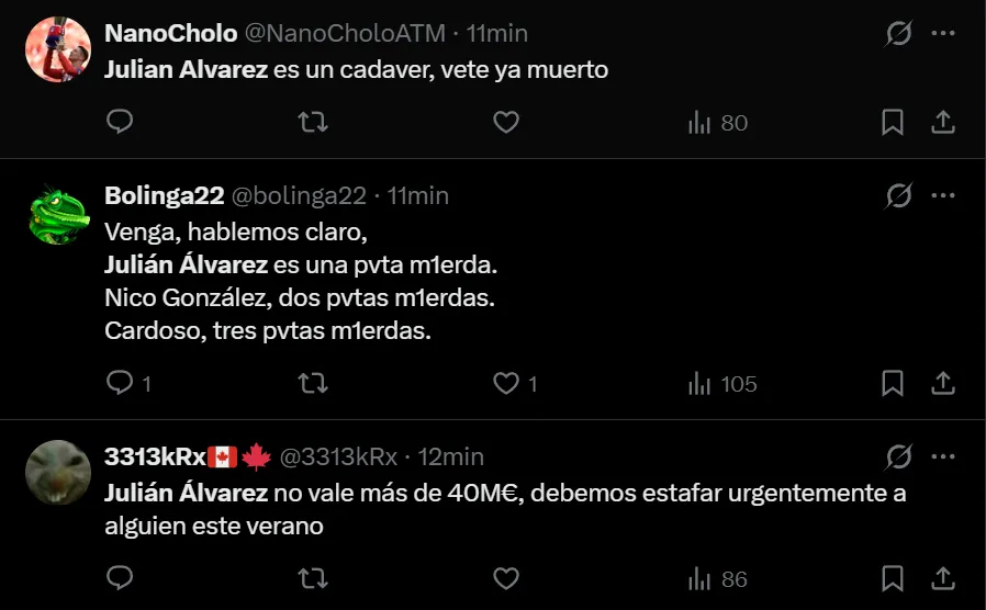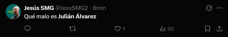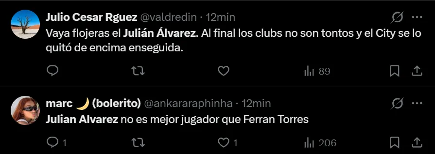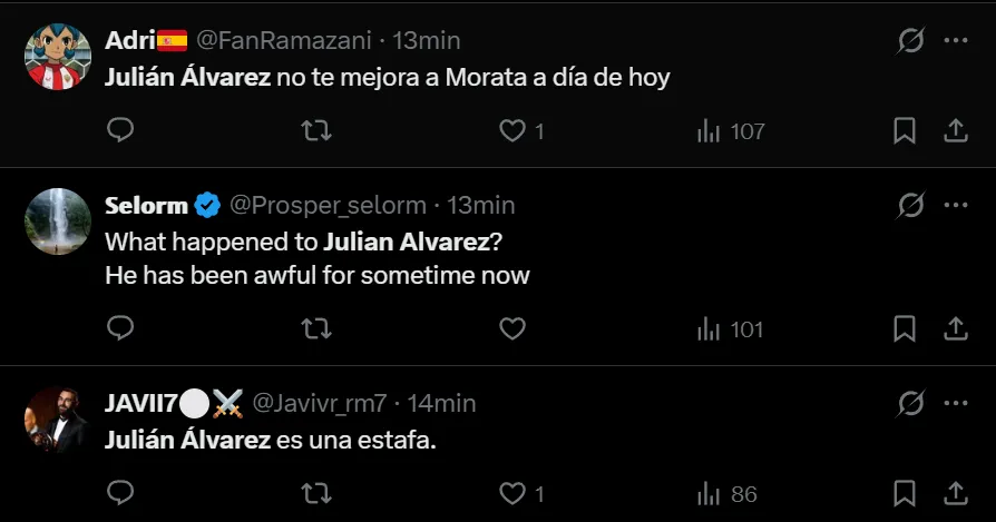 “Julián Álvarez es una estafa”, exclamó el usuario de X (ex Twitter) @javivr_rm7 para referirse al ex delantero de River y Manchester City. Pero no fue el único que despotricó contra el argentino que tiene un lugar asegurado en el Mundial de Estados Unidos, México y Canadá. También hubo comentarios como “he visto suficiente para decir que Julián Álvarez no es tan buen jugador como Ferrán Torres”, “Qué malo es Julián Álvarez” y “Julián Álvarez no está ni acertado ni concentrado en el juego”, entre otros, donde cuestionaron notablemente al campeón mundial.