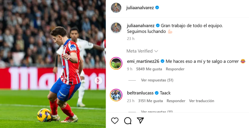 En su cuenta de Instagram, Julián compartió imágenes del Derbi y un experto en las definiciones desde los 12 pasos se hizo presente en la caja de comentarios. Dibu Martínez, su compañero en la Albiceleste, soltó un divertido mensaje que generó miles de reacciones.