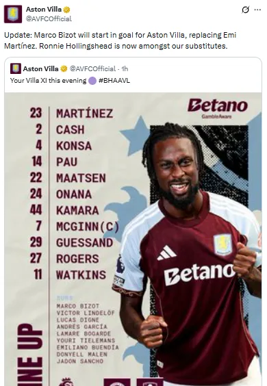 - Marco Bizot reemplazó a Martínez como titular en la derrota del Aston Villa ante Brighton.