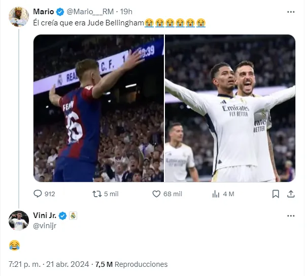 Allí, apareció Vinicius, y le respondió sutilmente esta chicana con un emoji de una carita riéndose por el posteo del hincha del Merengue. Este comentario rápidamente se viralizó entre hinchas del Real Madrid que celebraban al brasileño, y otros del Barcelona, que se quejaban al acusar de que los robaron en el clásico.