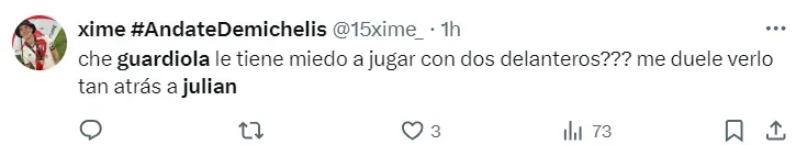 “Inentendible”, “inaceptable”, “le está sacando el brillo”, fueron algunos de los mensajes de los hinchas, fastidiados por las determinaciones del DT español. La bronca ya venía de la semana pasada, donde el entrenador dejó al 19 en el banco de suplentes para el partido de Champions League.