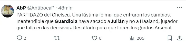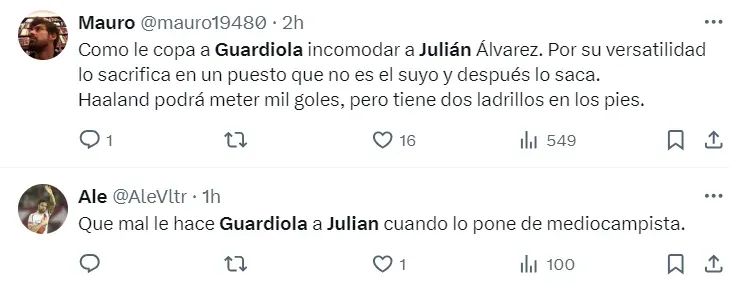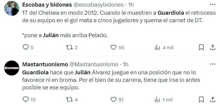 Manchester City y Chelsea repartieron puntos en el Etihad Stadium en el plato fuerte de la jornada de la Premier League. Julián Álvarez fue titular, pero estuvo mucho más lejos del gol que en otros partidos. En las redes sociales responsabilizaron a Pep Guardiola por el rol del argentino en el encuentro.