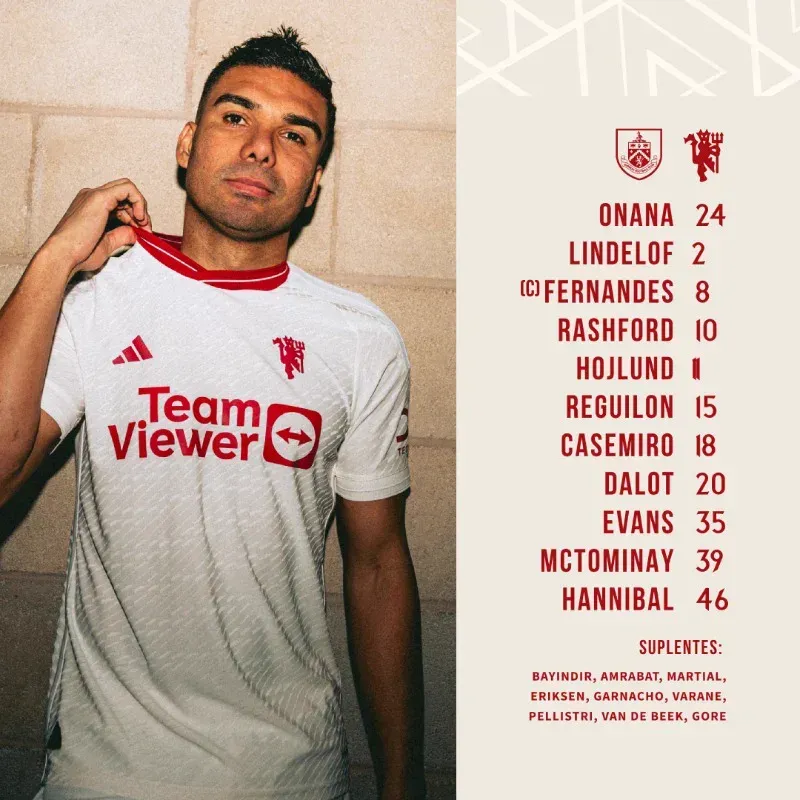 Para visitar a Burnley, el elenco dirigido por Erik ten Hag alineará con André Onana; Diogo Dalot, Victor Lindelöf, Jonny Evans, Sergio Reguilón; Scott McTominay, Casemiro, Hannibal Mejbri, Bruno Fernandes; Marcus Rashford y Rasmus Højlund.