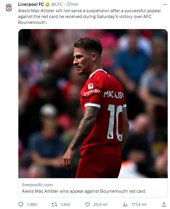 “Alexis Mac Allister no cumplirá una suspensión luego de una apelación exitosa contra la tarjeta roja que recibió durante la victoria del sábado sobre el AFC Bournemouth”, comunicó el conjunto inglés a través de sus redes sociales. De esta manera, podrá jugar este domingo.