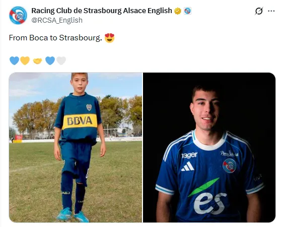 ”De Boca a Estrasburgo”, es la descripción del posteo del elenco galo, en la que también se pueden apreciar dos imágenes. De un lado se lo ve a un pequeño Aaron Anselmino con la camiseta que Boca uso en el 2013, y del otro, una actual del zaguero ya con la casaca de su flamante equipo.