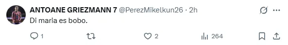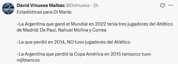 ”El Real Madrid es un club medio raro. Di María triunfó allí, pero cada vez que iba con la selección perdía finales de Copa América y Mundial. Se fue del Madrid y ganó todo. Mi razonamiento es una chorrada. Igual que el de Di María con el Atlético”, escribió el periodista David Vinuesa, que cubre la actualidad del Atleti para el portal Libertad Digital.