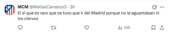 Asimismo, entre los comentarios de los aficionados se pueden leer opiniones como ”que relevancia se le puede dar a un medio pelo que hasta la copa america N°15 no lo bancaba nadie en argentina y que fue a retirar una copa a una oficina para poder decir que ganó algo” o ”pide permiso primero para hablar del Atleti. Manchas su nombre y no tienes clase para ello”.