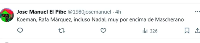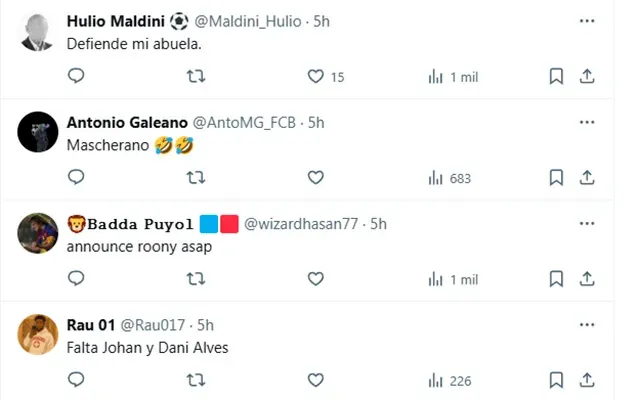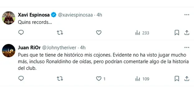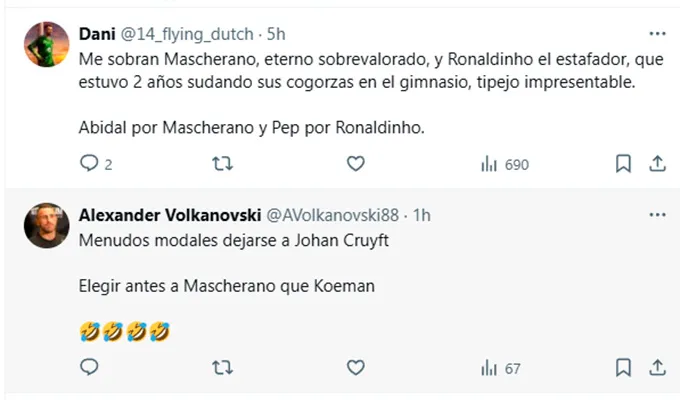 “Dime que no tienes 20 años sin decírmelo”, replicó un culé. “Koeman, Rafa Márquez, incluso Nadal, muy por encima de Mascherano”, intentó corregir otro. “Me sobran Mascherano, eterno sobrevalorado, y Ronaldinho el estafador, que estuvo 2 años sudando sus cogorzas en el gimnasio, tipejo impresentable. Abidal por Mascherano y Pep (Guardiola) por Ronaldinho”, arremetió un tercero. “Pues que te tiene de histórico mis cojones. Evidente no ha visto jugar mucho más, incluso Ronaldinho de oídas, pero podrían comentarle algo de la historia del club”, sentenció uno más.