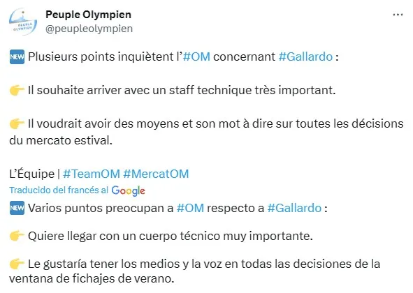 Las charlas fueron “largas y tendidas”, explicó Abdellah Boulma, periodista de RTL Foot, al momento de dar los primeros detalles de las conversaciones que mantuvo el ex River con la cúpula dirigencial de los Olímpicos. Si bien a Gallardo le hicieron saber sus intenciones al momento de ir a buscarlo, el propio entrenador también se puso firme a la hora de poner condiciones para volver al ruedo.