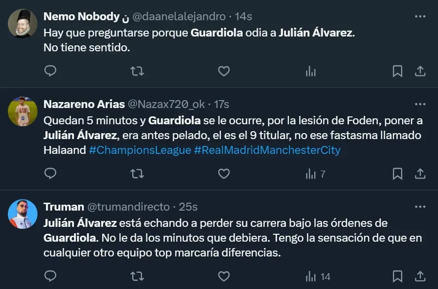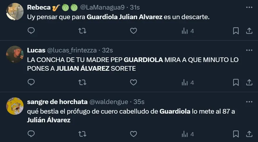 Las críticas de los hinchas a Guardiola por darle 8 minutos a Julián Álvarez