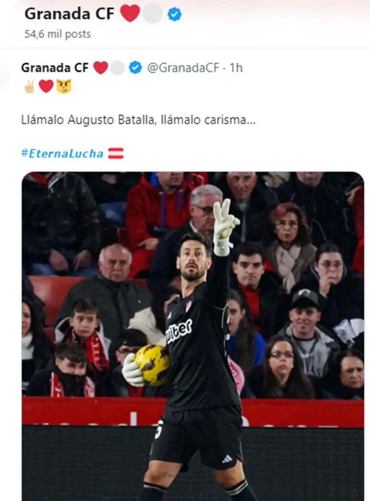 Producto de haber vuelto a sumar tres puntos después de siete partidos, en el equipo nazarí hubo algarabía que se trasladó a las redes sociales, donde volvió a haber una particular valoración del exarquero de San Lorenzo y River. “Llámalo Augusto Batalla, llámalo carisma”, se leyó para destacar a quien por primera vez en las 19 jornadas que se llevan disputadas de La Liga logró dejar el arco en cero.