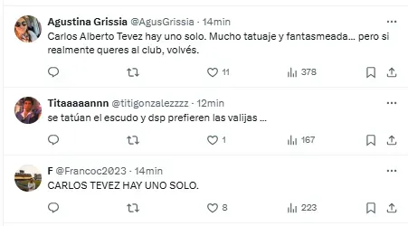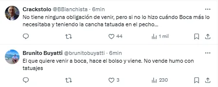 Entre los tópicos más recurrentes en los comentarios están su nuevo contrato en Roma, la cuestión económica y la eterna comparación con el caso de Carlitos Tevez y su vuelta a Boca a pocos días de disputar la final de la Champions con Juventus, asegurando que Apache “hay uno solo”.