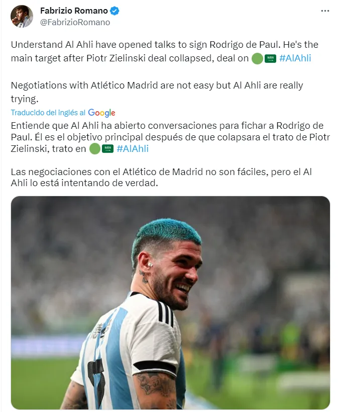 “Al-Ahli ha abierto conversaciones para fichar a Rodrigo de Paul. Él es el objetivo principal después de que colapsara el trato de Piotr Zielinski… Las negociaciones con el Atlético de Madrid no son fáciles, pero el Al-Ahli lo está intentando de verdad“, reveló el periodista especializado en fichajes Fabrizio Romano a través de sus redes sociales. ¿El precio que pagarían por el socio de Messi en la Selección Argentina? Aún es un misterio, aunque su cotización supera los 50 millones de euros.