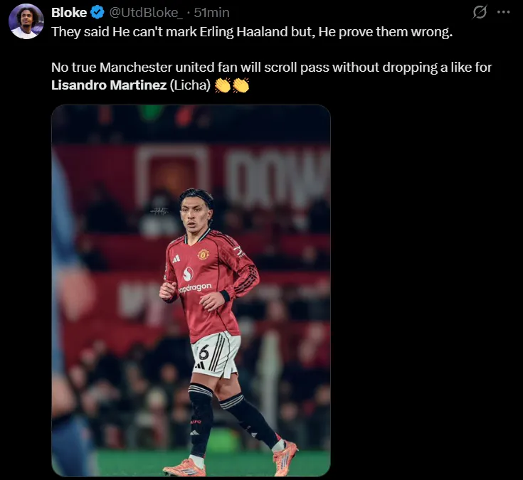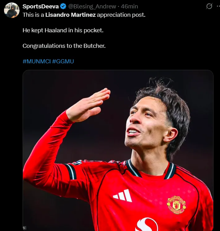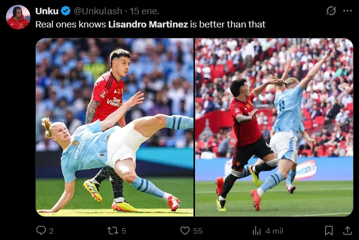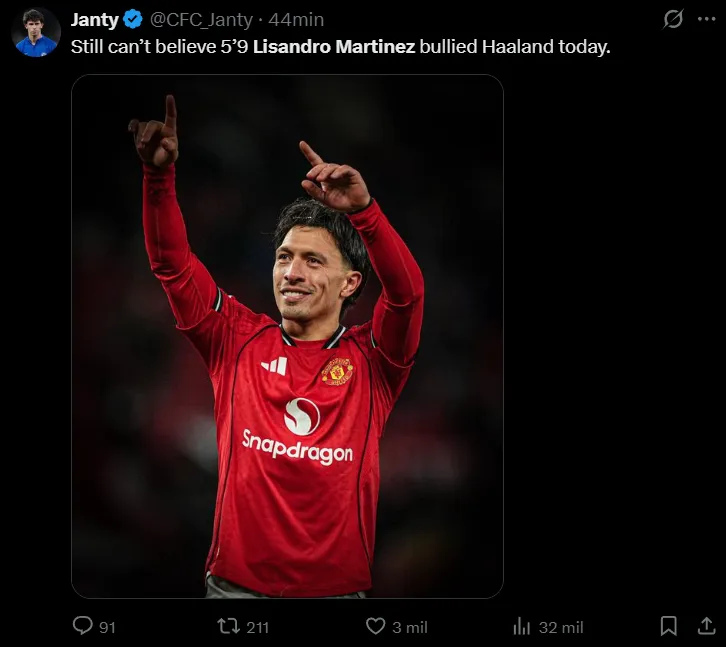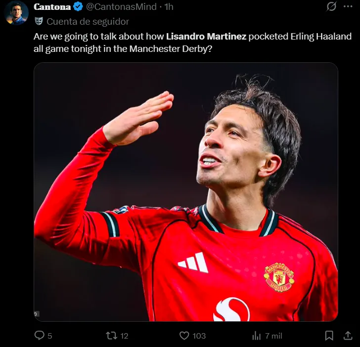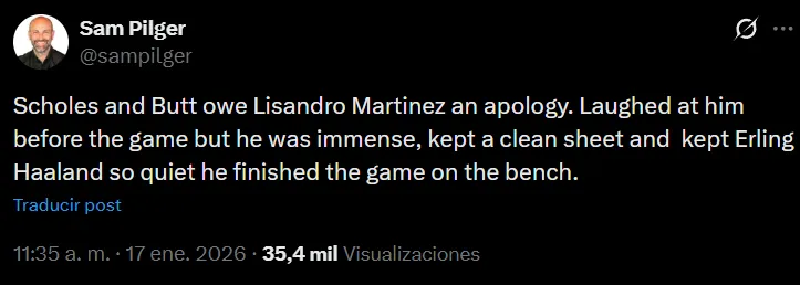“Dijeron que no podía marcar a Erling Haaland, pero les demostró lo contrario. Ningún aficionado del Manchester United se desviará sin darle un me gusta a Lisandro Martínez”, comentó otro de ellos en la misma línea. “¿Vamos a hablar de cómo Lisandro Martínez se embolsó a Erling Haaland durante todo el partido de esta noche en el derbi de Manchester?”, inquirió un tercero. “Scholes y Butt le deben una disculpa a Lisandro Martínez. Se rieron de él antes del partido, pero estuvo inmenso, mantuvo su portería a cero y mantuvo a Erling Haaland tan tranquilo que terminó el partido en el banquillo”, destacó uno más.