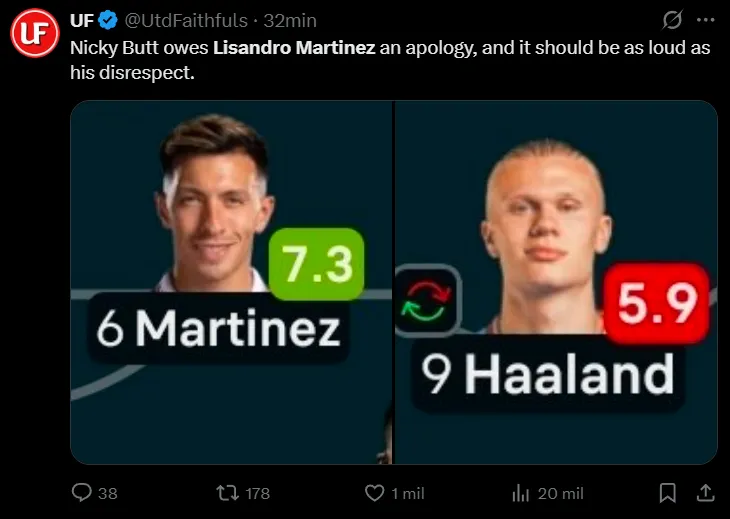 “¿Acabo de ver a Lisandro Martínez superar físicamente a Erling Haaland en una entrada? ¿Nicky Butt y Paul Scholes están viendo? Salgan”, escribió un hincha de Manchester United en X compartiendo una jugada específica en la que el argentino anticipó al gigante noruego en mitad de cancha, haciendo clara referencia al déficit que le habían achacado los dos históricos.