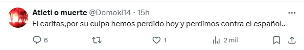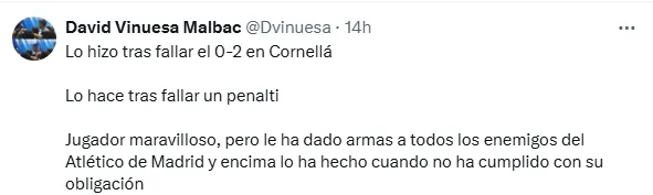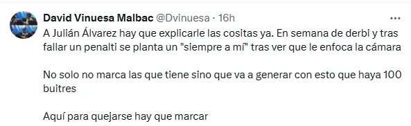Y en relación puntualmente al ruido que puede generar en la previa del Derbi Madrileño del próximo sábado, apuntaron: ”A Julián Álvarez hay que explicarle las cositas ya. En semana de derbi y tras fallar un penalti se planta un “siempre a mí” tras ver que le enfoca la cámara No solo no marca las que tiene sino que va a generar con esto que haya 100 buitres. Aquí para quejarse hay que marcar”.