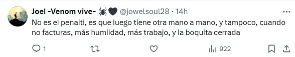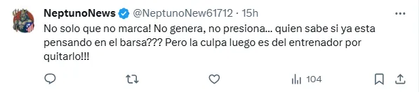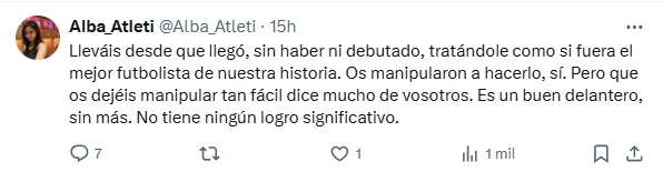 ”Lleváis desde que llegó, sin haber ni debutado, tratándole como si fuera el mejor futbolista de nuestra historia. Os manipularon a hacerlo, sí. Pero que os dejéis manipular tan fácil dice mucho de vosotros. Es un buen delantero, sin más. No tiene ningún logro significativo”, se lee entre los cientos de mensajes que apuntan contra Julián Alvarez.