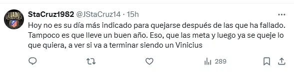 ”Hoy no es su día más indicado para quejarse después de las que ha fallado. Tampoco es que lleve un buen año. Eso, que las meta y luego ya se queje lo que quiera, a ver si va a terminar siendo un Vinicius”, le lanzaron desde otro costado.