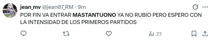 En ese contexto, los hinchas del Madrid viralizaron la situación haciendo hincapié en el tiempo que estuvo fuera. “Hace tantísimo que no vemos a Mastantuono que ya no es ni rubio“, fue uno de los comentarios. La burla, lejos de ser malintencionada, reflejó la alegría de ver al jugador tras semanas de ausencia. Ahora, buscará recuperar ritmo en los dos partidos que le restan disputar en el año para así comenzar el 2026 al ciento por ciento.